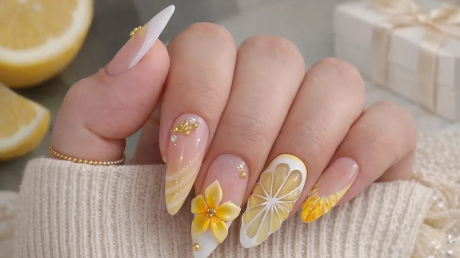 Fruit-themed nail art, such as strawberries, cherries, and lemons, adds a playful and youthful vibe. These designs are ideal for casual outings and vacations.