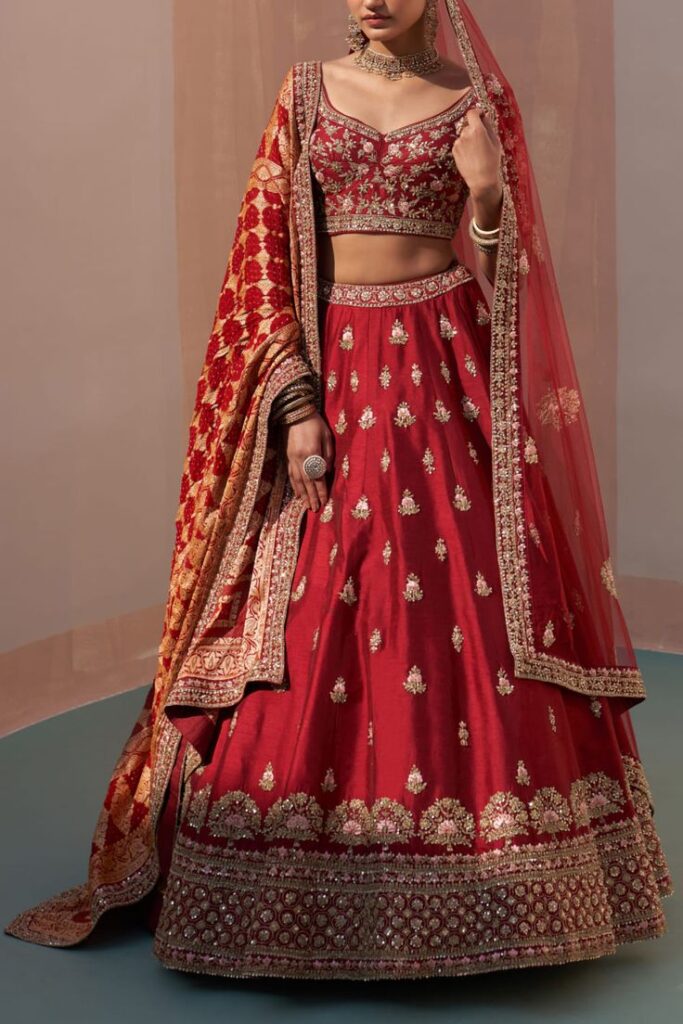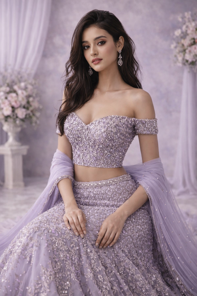 This style is especially popular with lehengas. The dupatta is draped over one shoulder and spread across the front, highlighting the blouse and embroidery.