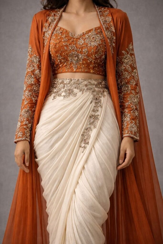 In this modern twist, the dupatta is styled like a cape, covering the shoulders and sometimes stitched or pinned to create a flowing layer.