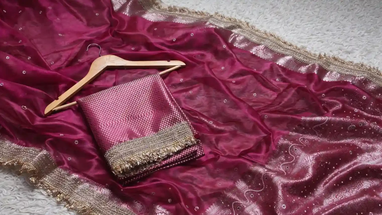 Organza, also known as Kora silk, is lightweight and sheer. It is woven using fine silk threads combined with zari, resulting in delicate yet intricate patterns. These sarees offer a graceful and airy appearance.
